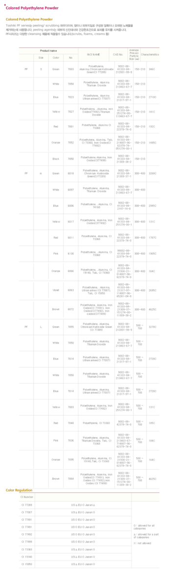 Toshiki PF series는 peeling/ scrubbing 파우더이며, 땀이나 피부지질로 구성된 얼룩이나 오래된 노폐물을 제거하는데 사용됩니다. peeling agents는 피부의 신진대사와 건강한조건으로 표피를 유지를 시켜줍니다. PF시리즈는 다양한 cleansing 제품에 적용할수 있습니다.(scrubs, foams, creams 등)