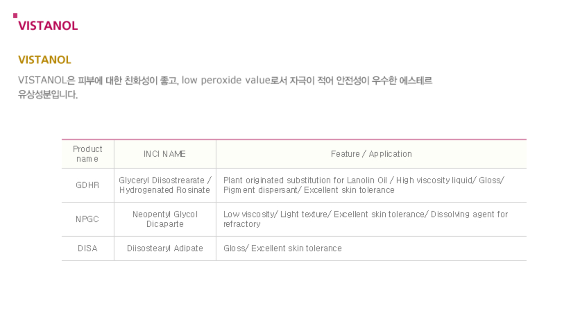 VISTANOL은 피부에 대한 친화성이 좋고, low peroxide value로서 자극이 적어 안전성이 우수한 에스테르 유상성분입니다.