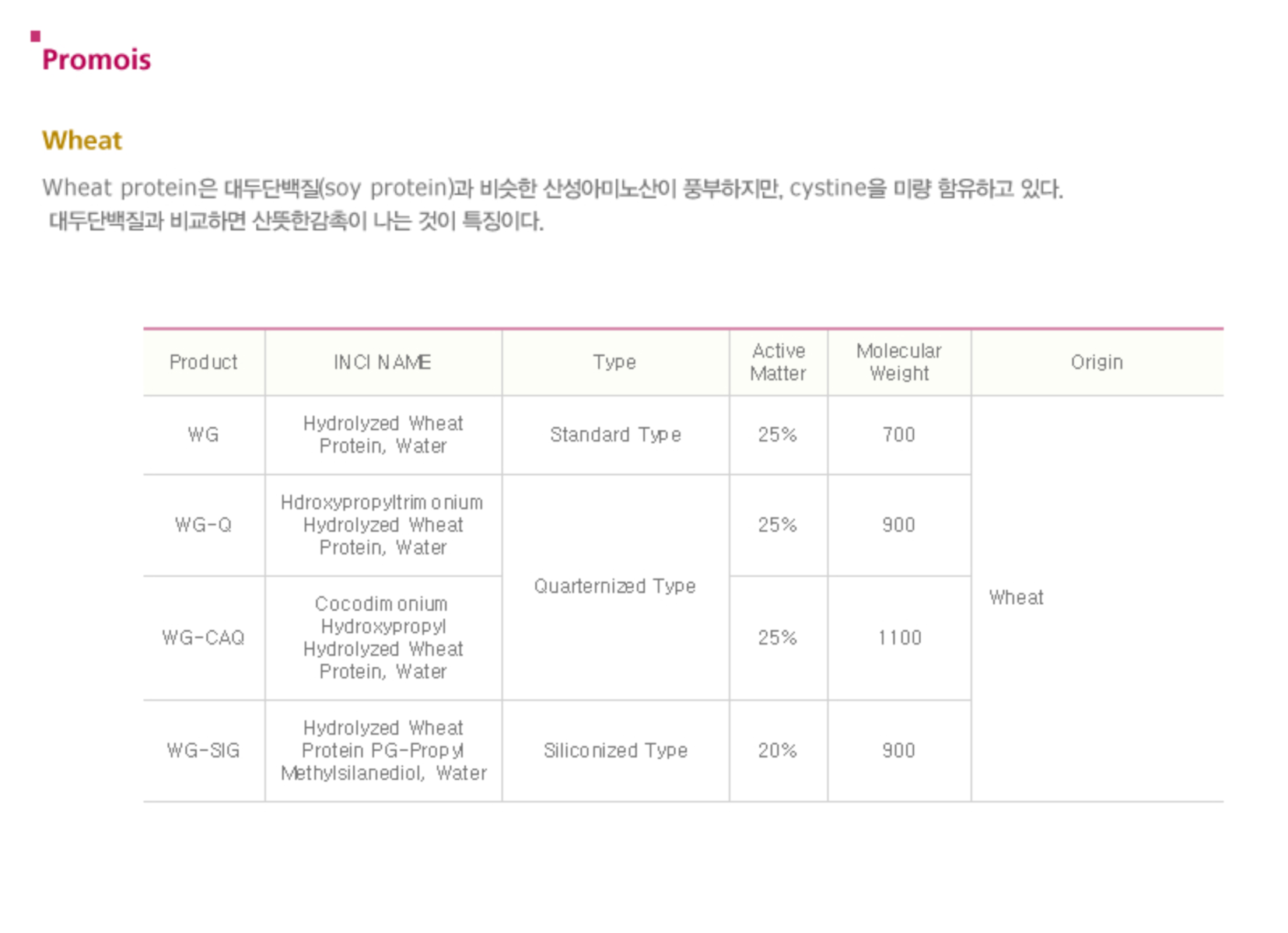 Wheat protein은 대두단백질(soy protein)과 비슷한 산성아미노산이 풍부하지만, cystine을 미량 함유하고 있다. 대두단백질과 비교하면 산뜻한감촉이 나는 것이 특징이다.