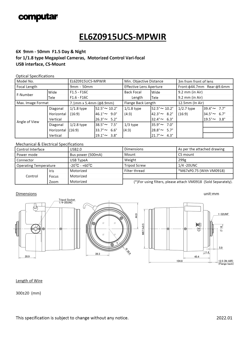 USB 케이블을 통해 전원 공급 및 Focus, Iris, Zoom 제어 가능